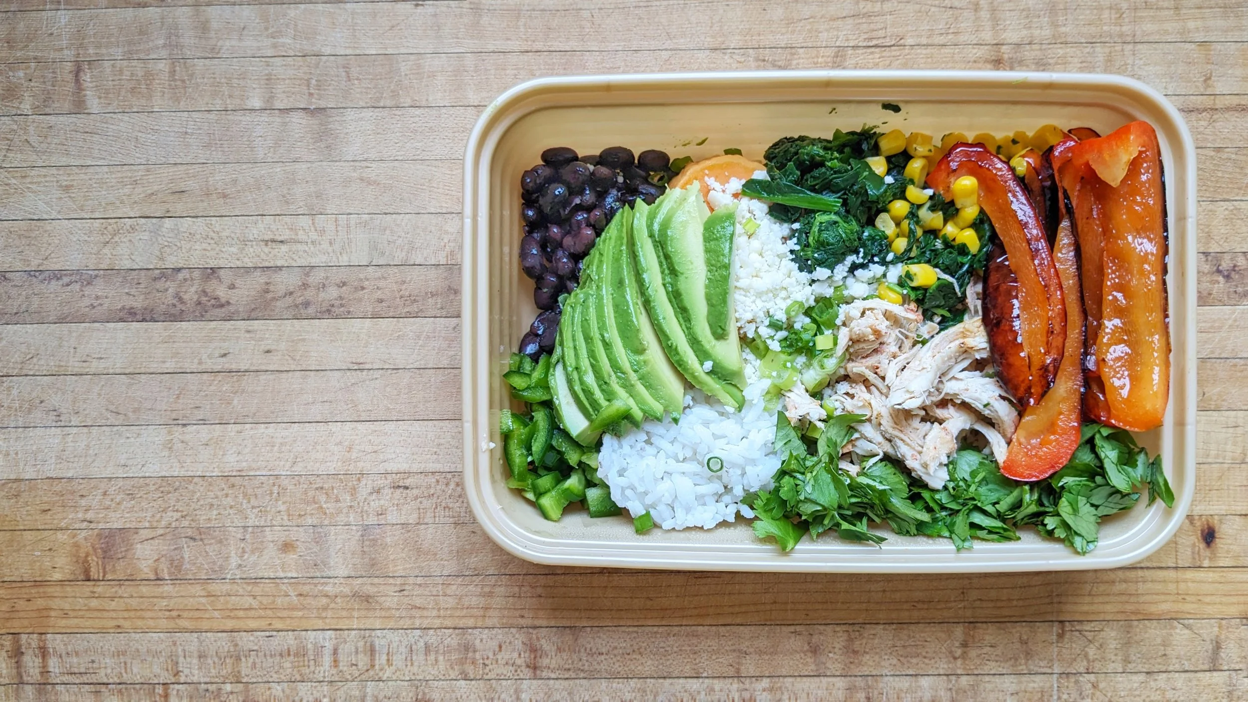 - Includes these components: Lean Protein, non-starchy veggies, Starchy Carbs (grains, legumes, Starchy veggies, fruits), and fat.